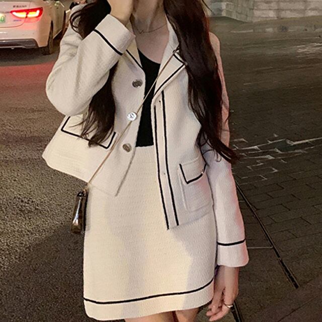 きれいめな無地カラーの長袖ジャケットとミニ丈スカートのセットです♡