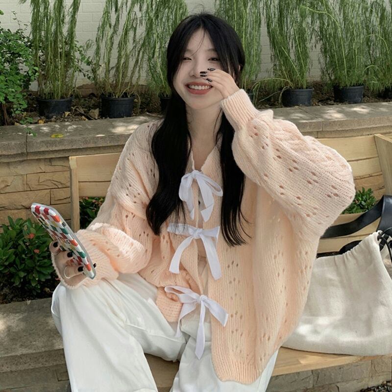 ニット長袖 かぎ針編み リボン シンプル 無地 大人可愛い レトロ キュート ナチュラル ゆったり