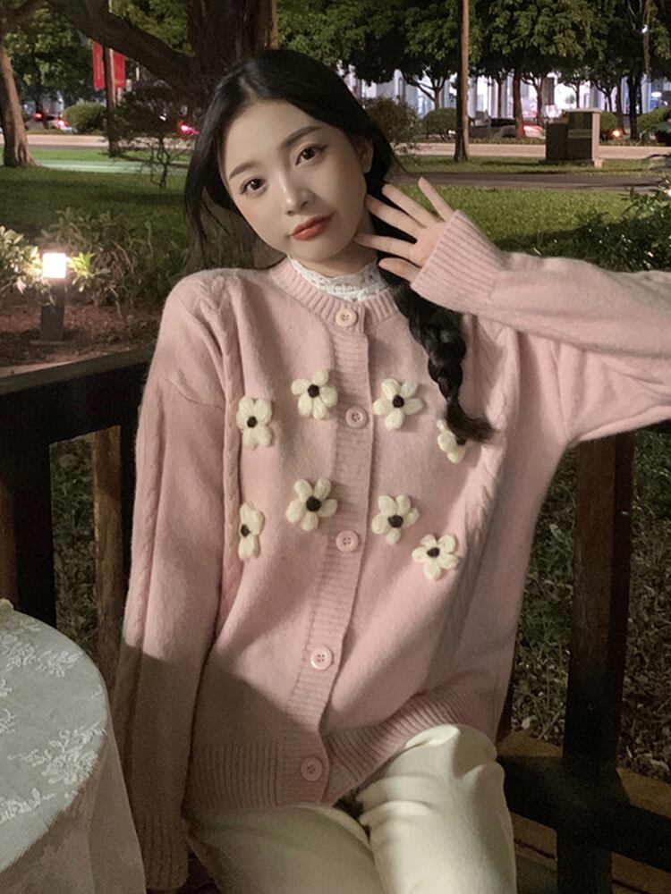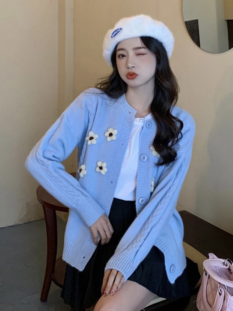 ニット カーディガン セーター 秋 冬 ブルー ピンク 花