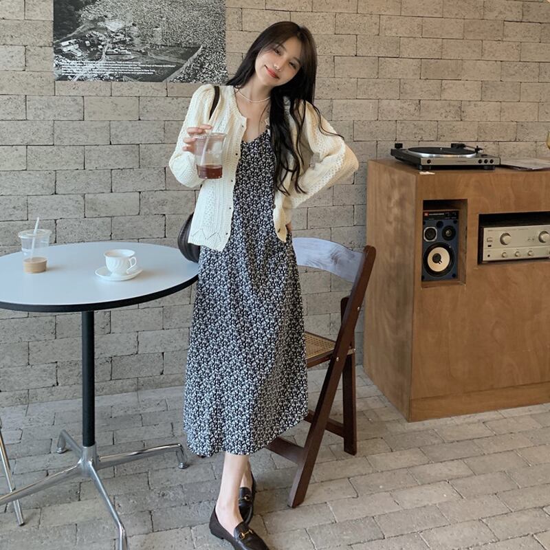 大人可愛い小花柄デザインのキャミソールワンピースとニットカーディガンです♡