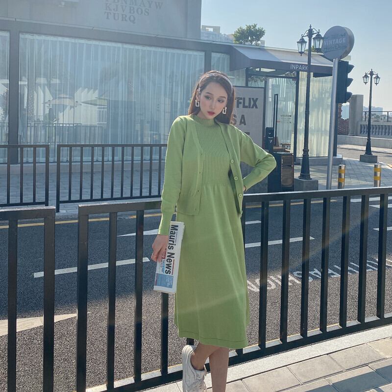 大人カジュアルな無地カラーのニットカーディガンと膝丈ニットワンピースです♡