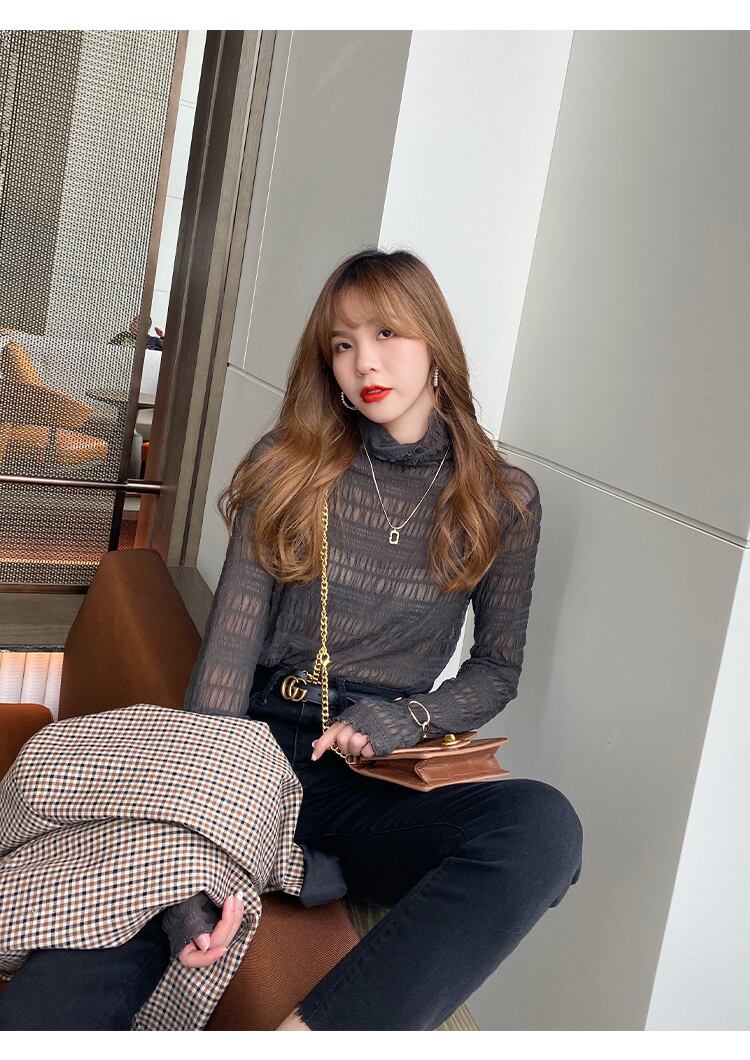 ブラウス カットソー 長袖 プチハイネック フリル シアー 透け感 シンプル 無地 大人可愛い デート