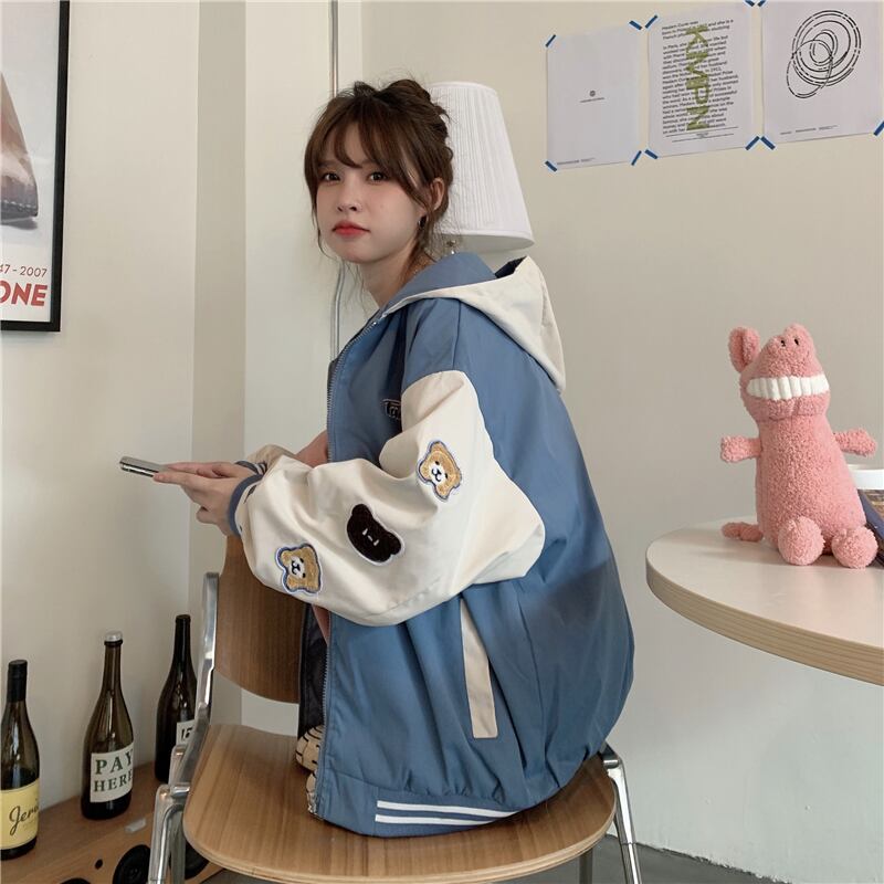 ブルゾン ジャンパー 長袖 フーディー バイカラー クマ ゆったり カジュアル キュート オーバーサイズ