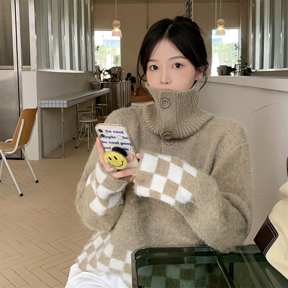 ニット セーター 長袖 シンプル 無地 ブロックチェック ハイネック 大人カジュアル ゆったり