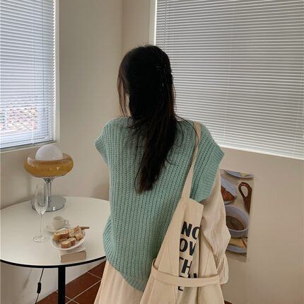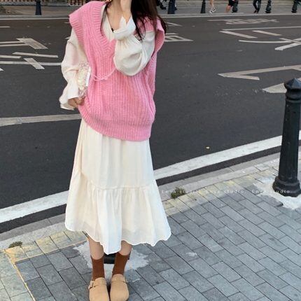 ワンピース ホワイト フレア ピンク ベスト ニット ブルー Vネック