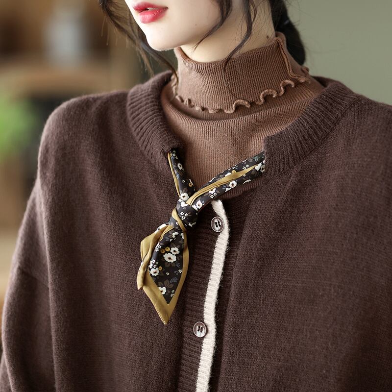 ニット カーディガン 長袖 フロントボタン ラウンド根来 スカーフ付き シンプル 無地 大人カジュアル