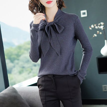 トップス ニット リボン 細身 ブラック ブルー ホワイト ブラウン ラメ