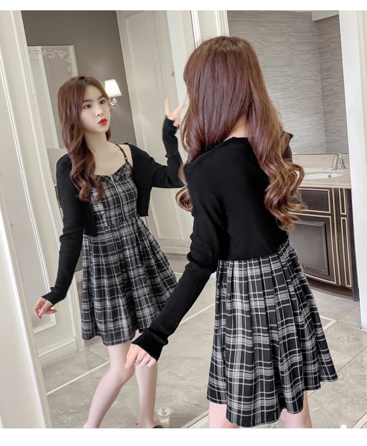 大人可愛いチェック柄のキャミソールワンピースとカーディガンのセットです。