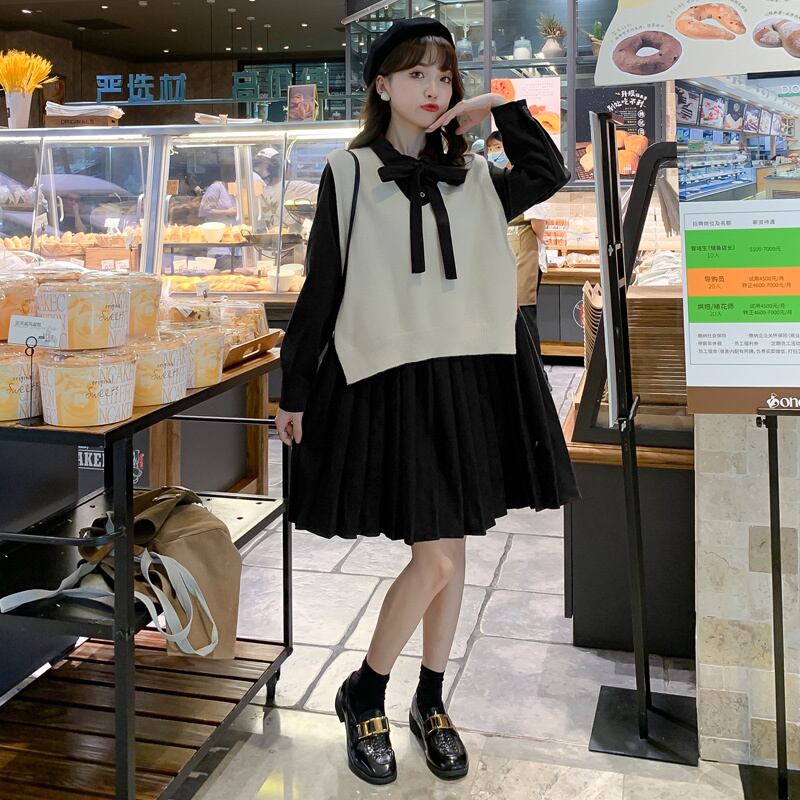 ワンピース 長袖 膝丈 フレア プリーツ ベスト付き リボン シンプル 無地 大人可愛い デート