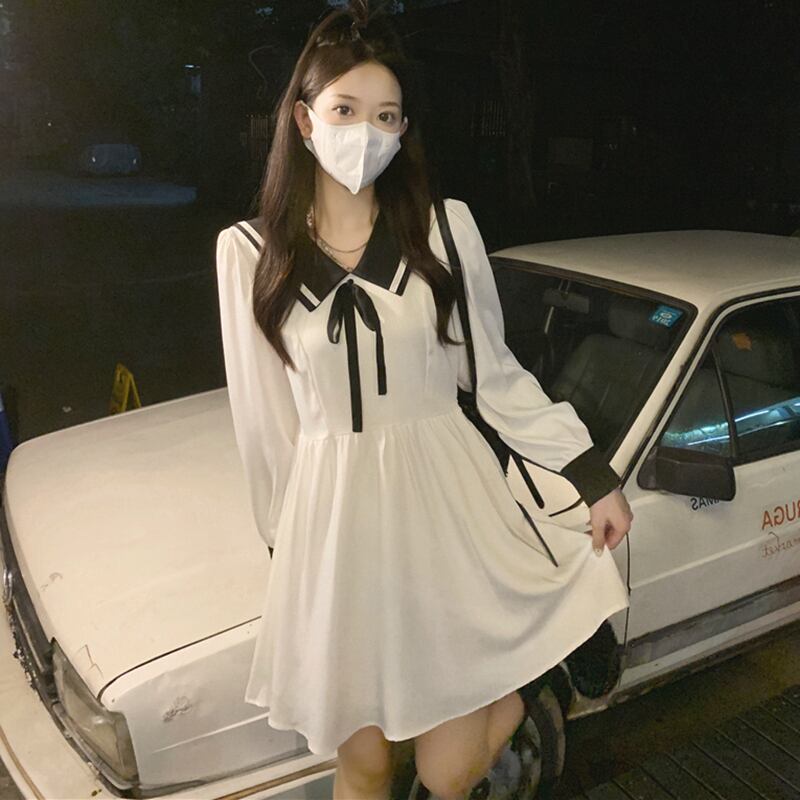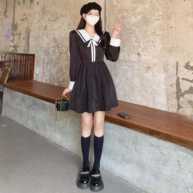 ワンピース 長袖 ミニ丈 フレア セーラー風 リボン 大人可愛い 清楚 デート お出かけ