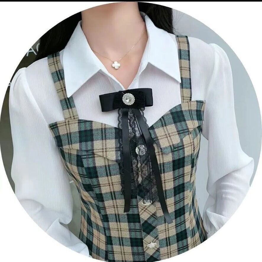 ワンピース 長袖 ミニ丈 フレア 重ね着風 チェック柄 リボン キュート デート お出かけ