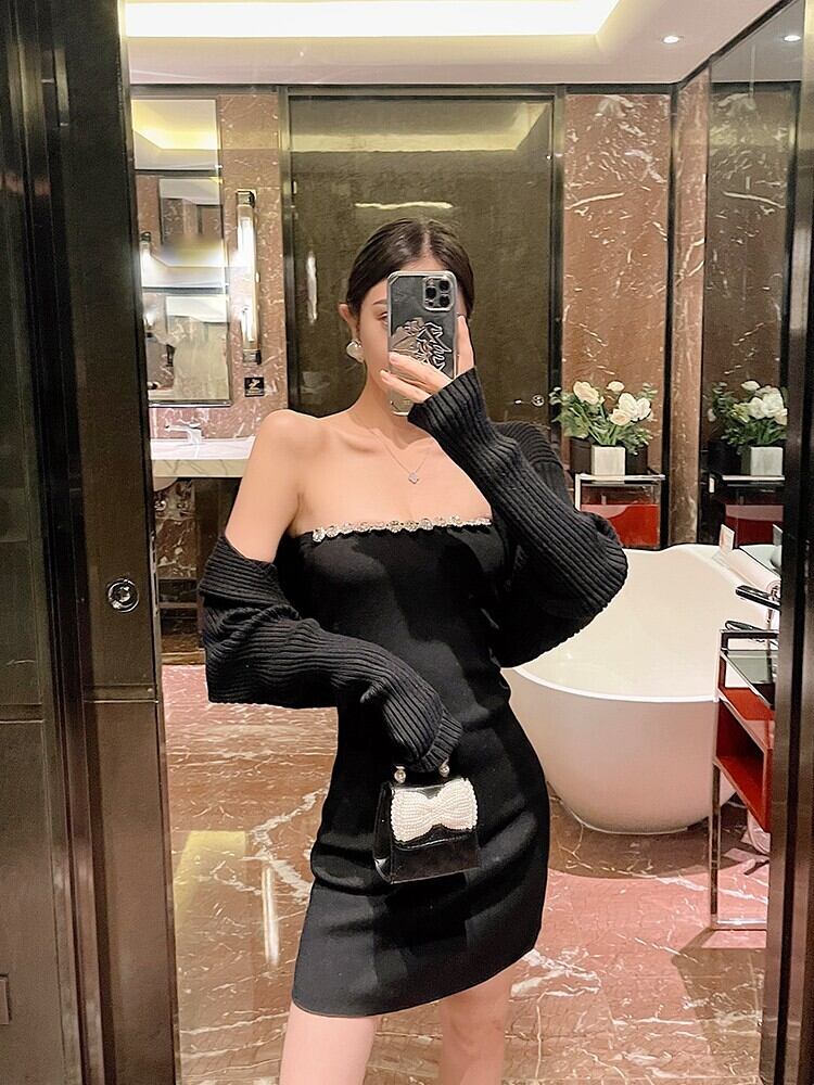 セットアップ ツーピース カーディガン ボレロ ワンピース 膝丈 タイト ビジュー ニット きれいめ