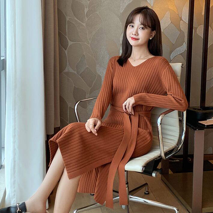 ワンピース ニットワンピース 長袖 膝丈 Vネック リブニット ウエストリボン シンプル 大人カジュアル