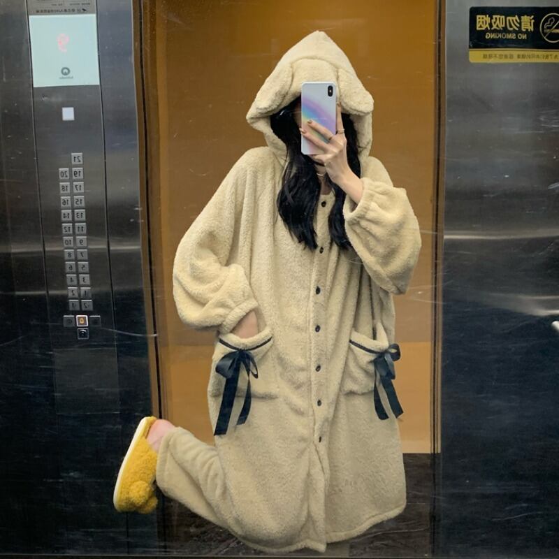 セットアップ ツーピース ルームウェア 長袖 フード付き ロング丈 ガウン パンツ ボア リボン
