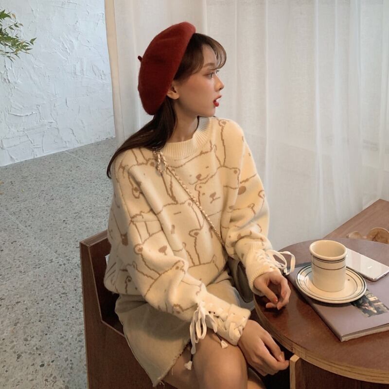 ニット セーター 長袖 クマ柄 大人可愛い キュート レースアップ 薄手 デート お出かけ