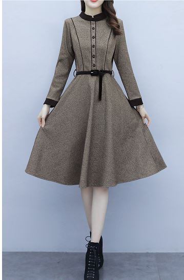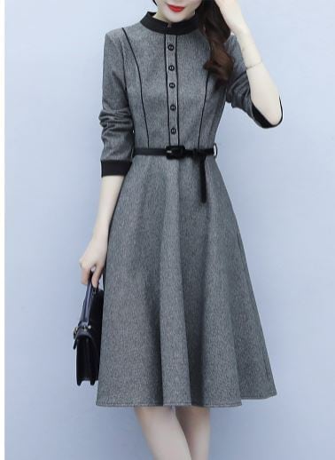 ワンピース 長袖 膝丈 フレア フロントボタン パイピング ウエストベルト シンプル 無地 きれいめ