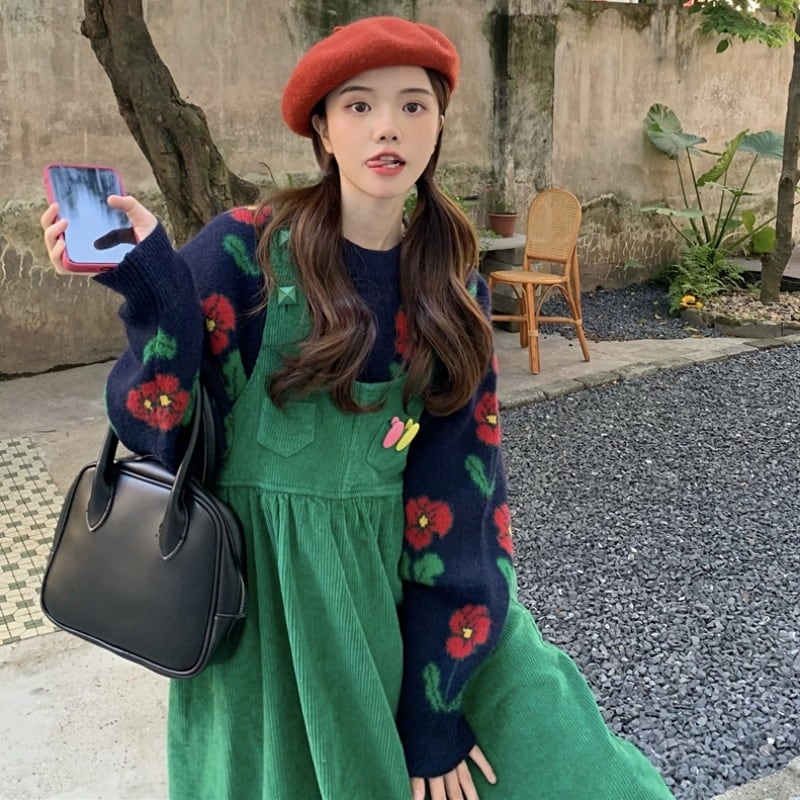 セットアップ ツーピース ニット セーター 長袖 花柄 ワンピース ジャンパースカート 膝丈 大人可愛い