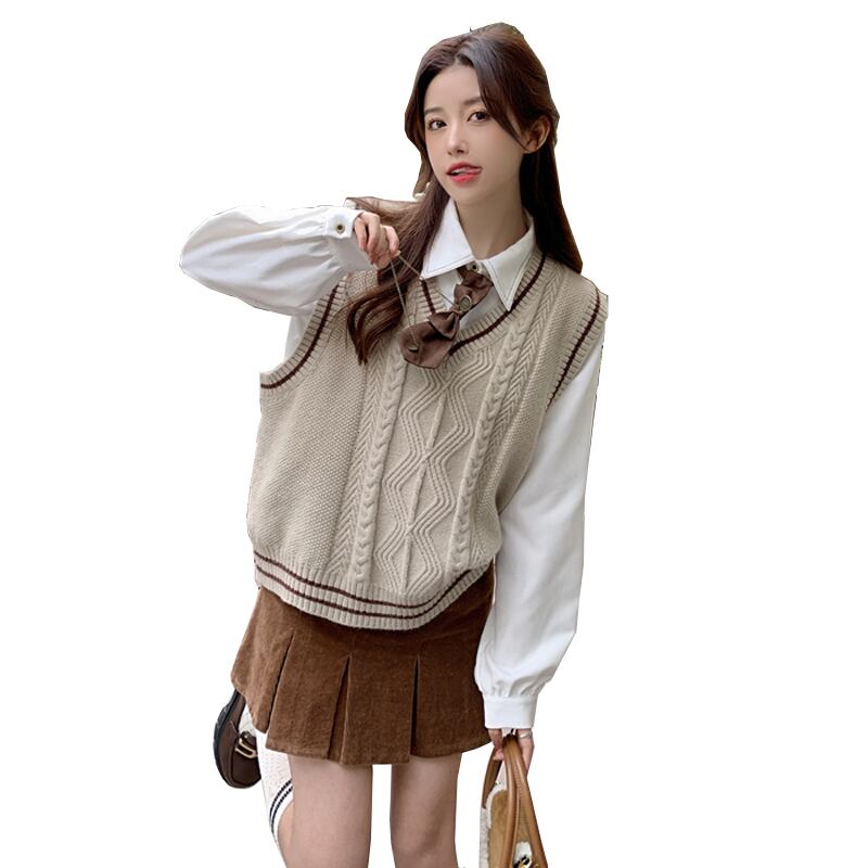 カジュアルな無地カラーのブラウスとニットベストとミニ丈スカートのセットです。