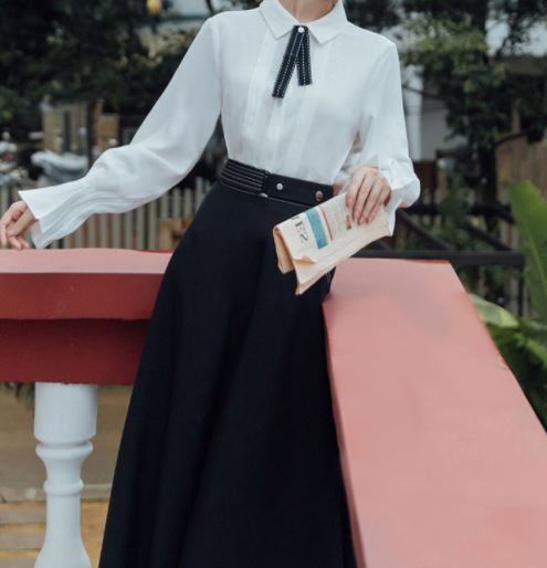 きれいめな無地カラーの長袖ブラウスとミモレ丈スカートのセットです。