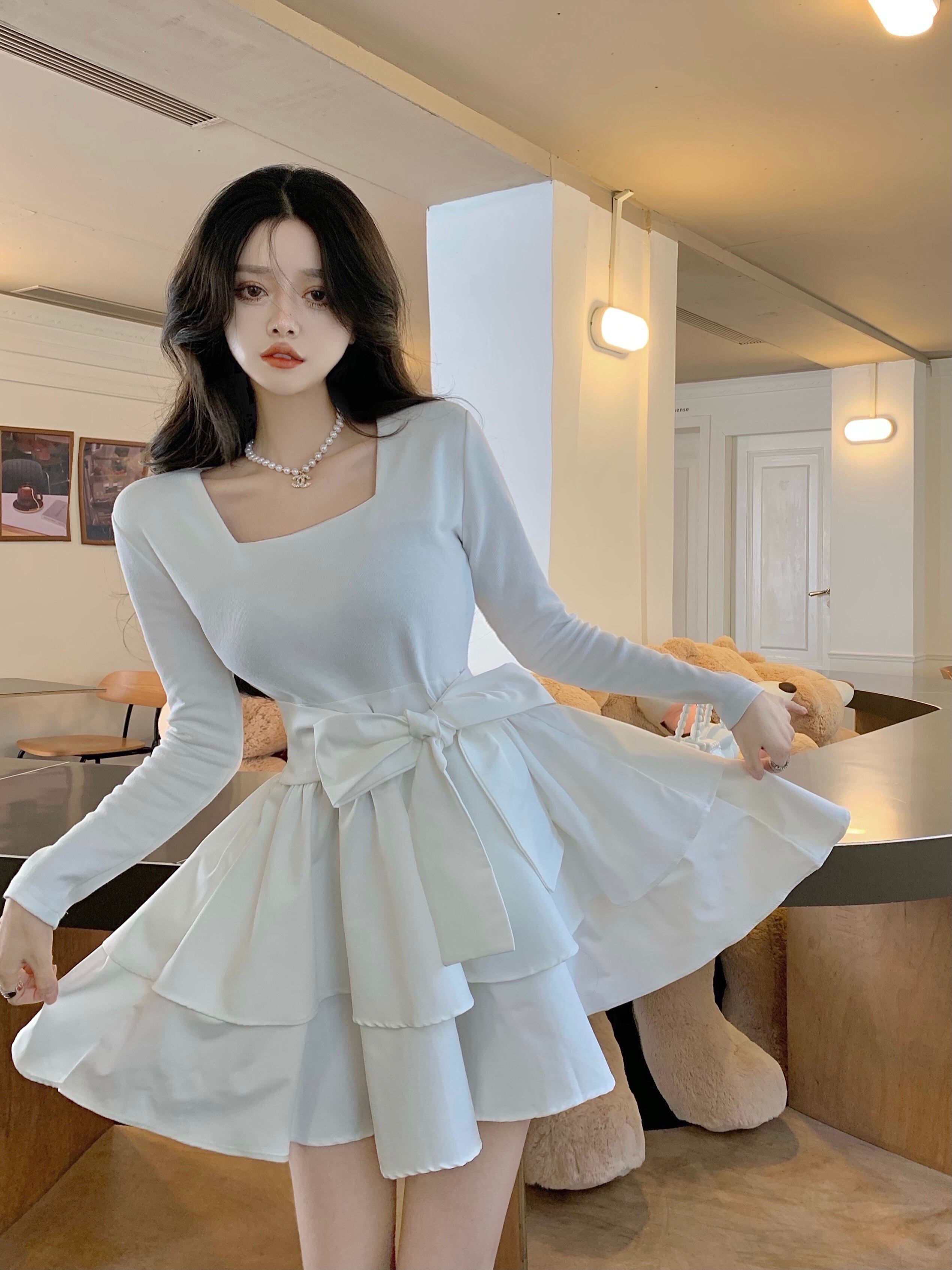 ワンピース 長袖 ミニ丈フレア フリル スクエアネック ウエストリボン 上品 キュート デート お出かけ