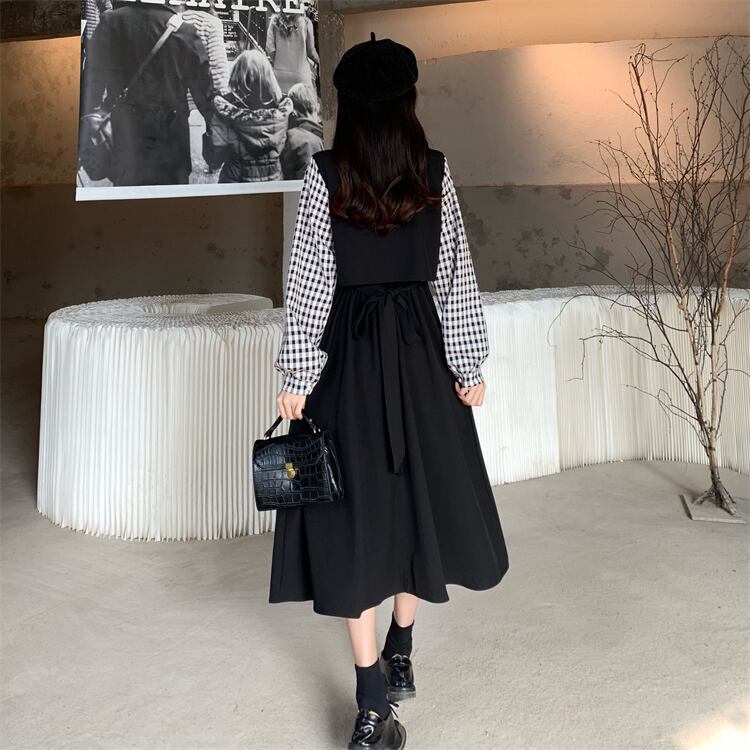 ワンピース長袖 膝丈 フレア チェック柄 モノトーン 大人カジュアル 重ね着風 デート お出かけ