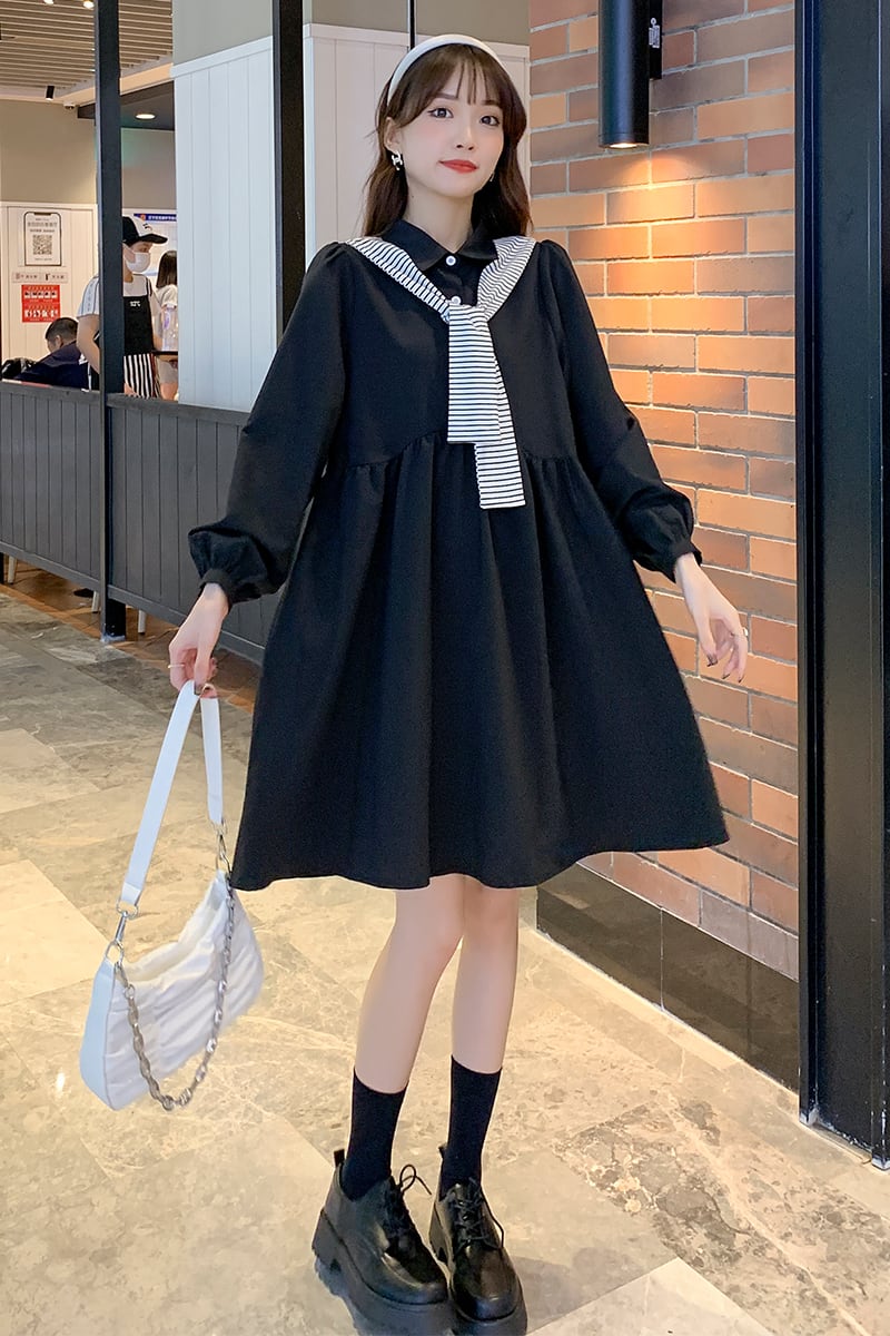 ワンピース 長袖 膝丈 フレア 肩掛け風 シンプル 無地 大人カジュアル デート お出かけ