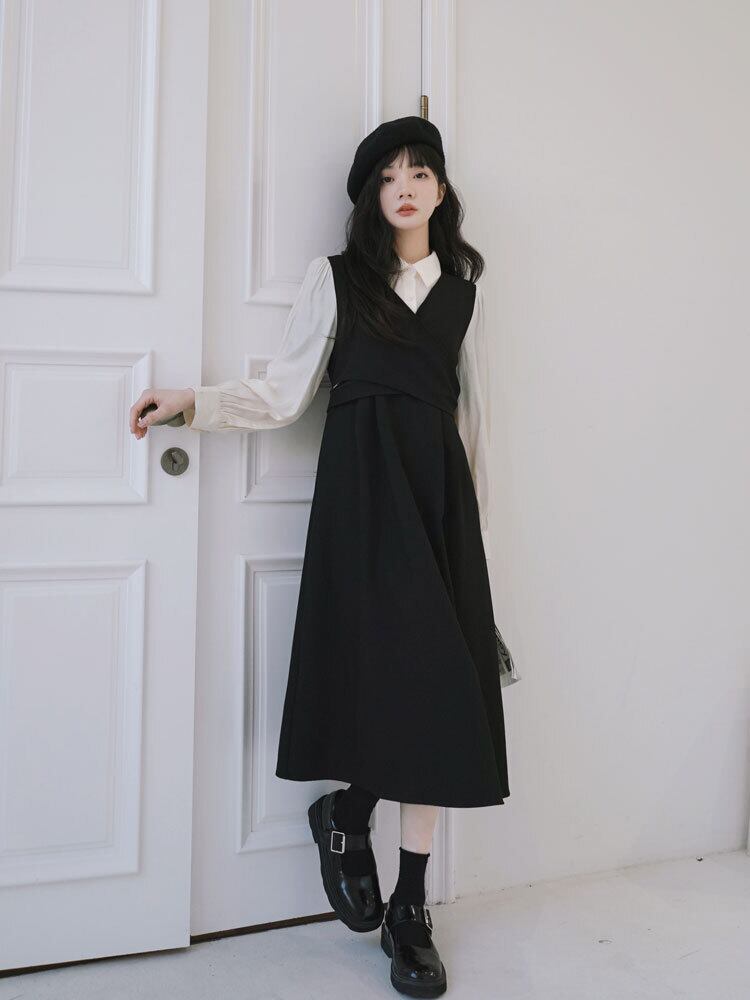 ワンピース 長袖 膝丈 フレア 重ね着風 ドッキングデザイン 大人カジュアル シンプル デート お出かけ