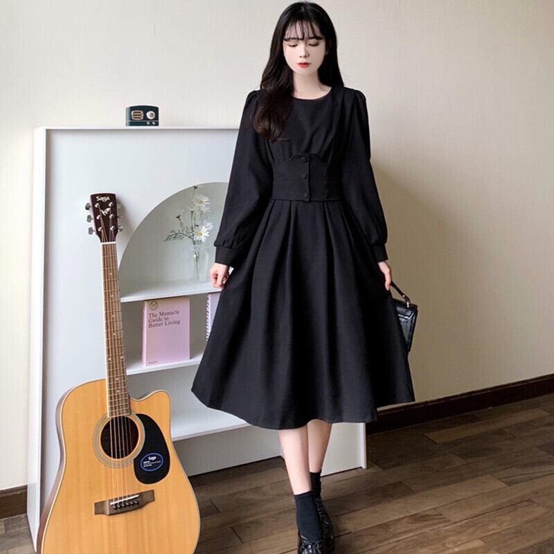ワンピース 長袖 膝丈フレア くびれデザイン シンプル 無地 大人カジュアル きれいめ デート お出かけ