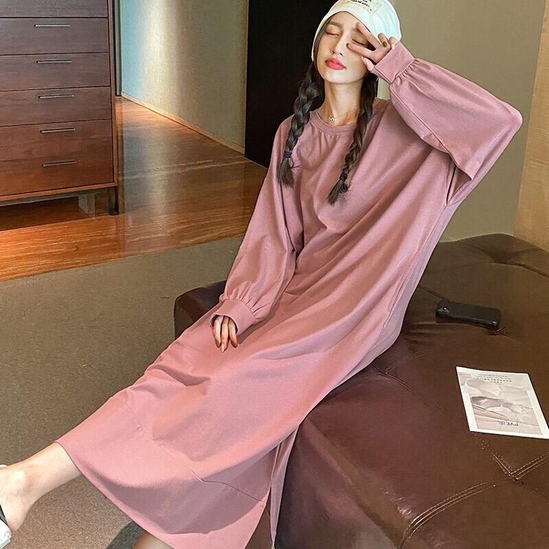 大人カジュアルな無地カラーのロング丈ワンピースです。