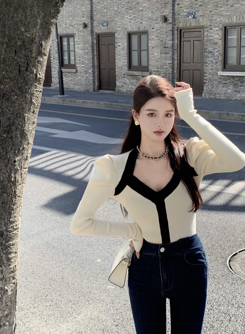 ニット セーター 長袖 Vネック シンプル 無地 大人カジュアル きれいめ モノトーン バイカラー