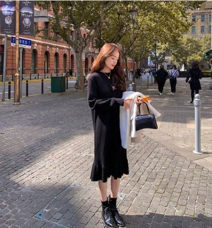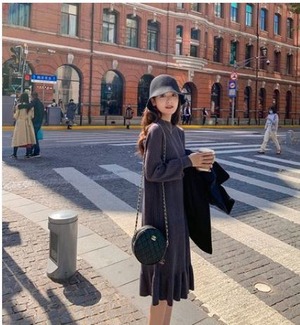 ワンピース ニットワンピース 膝丈 フレア 裾フリル シンプル 無地 大人カジュアル 大人可愛い デート