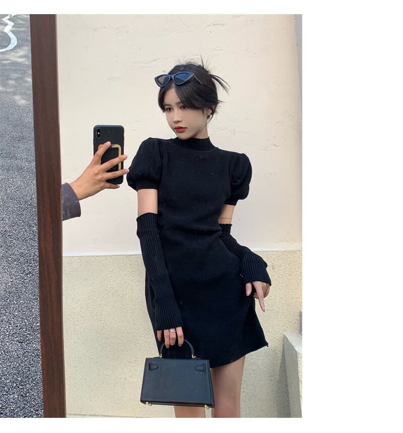 ワンピース ニットワンピース 半袖 ミニ丈 パフスリーブ アームウォーマー 大人可愛い デート お出かけ