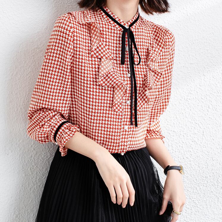ブラウス シフォンブラウス 長袖 千鳥格子柄 フリル リボン 大人カジュアル 大人可愛い デート お出かけ