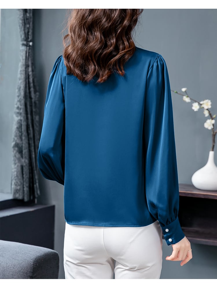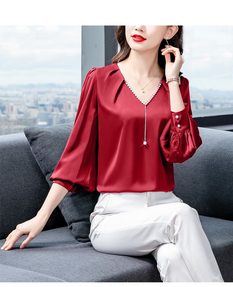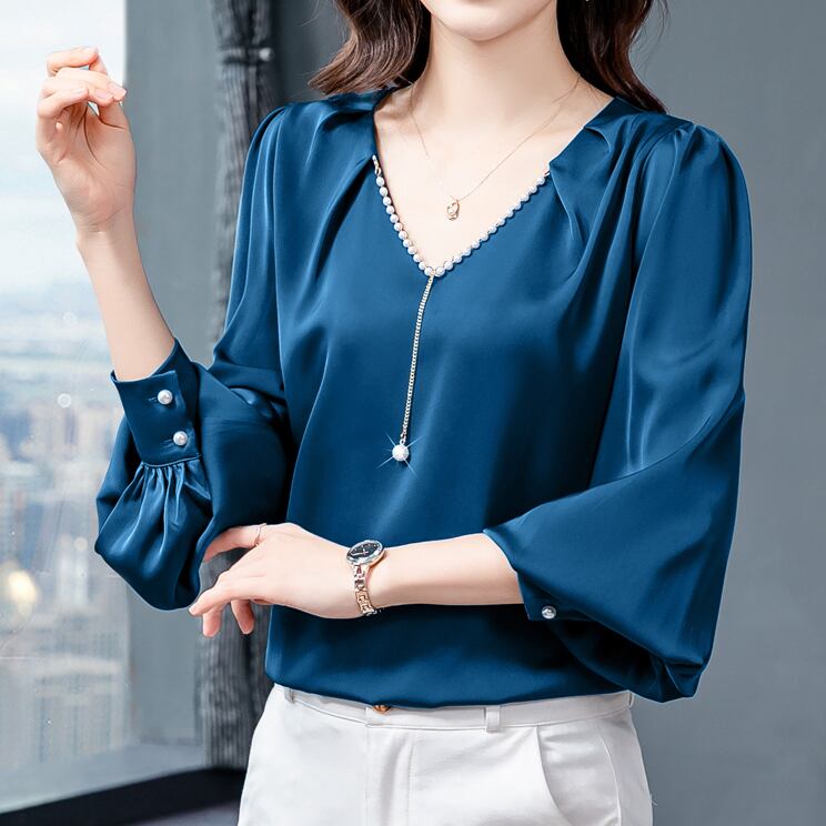 ブラウス シフォンブラウス 長袖 Vネック パールデザイン シンプル 無地 きれいめ 上品