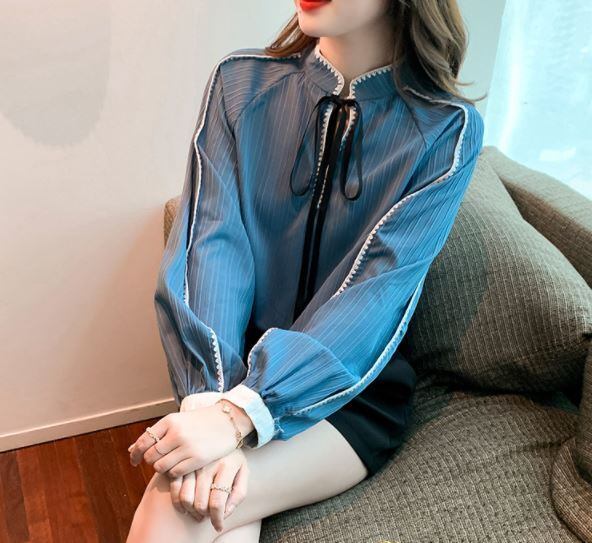 ブラウス シャツ 長袖 ノーカラー リボン パイピング シンプル 無地 大人カジュアル きれいめ jyohinn