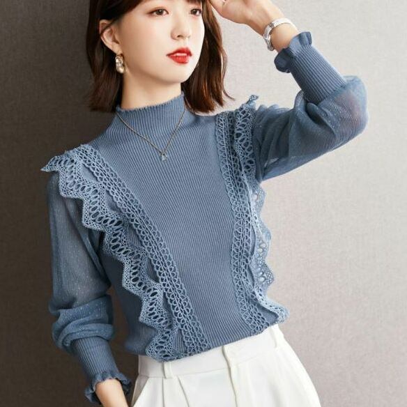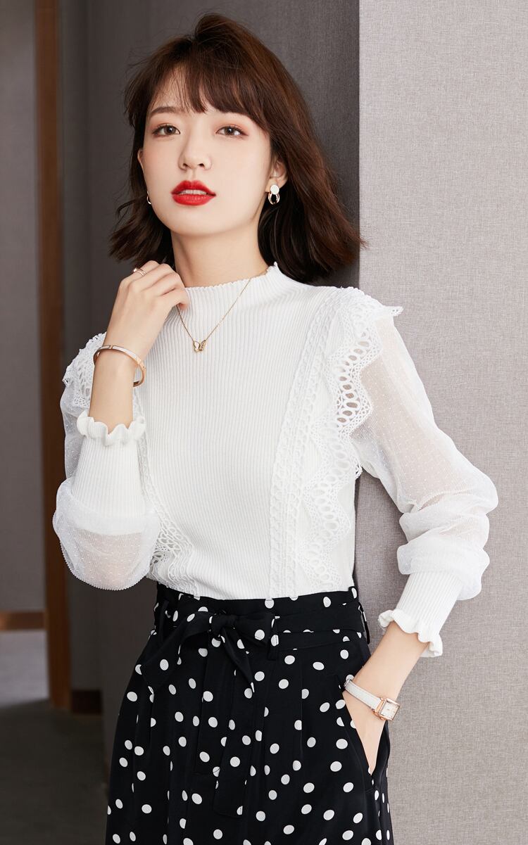 ブラウス カットソー 長袖 リブ レース フリル 大人可愛い きれいめ 上品 無地 デート お出かけ