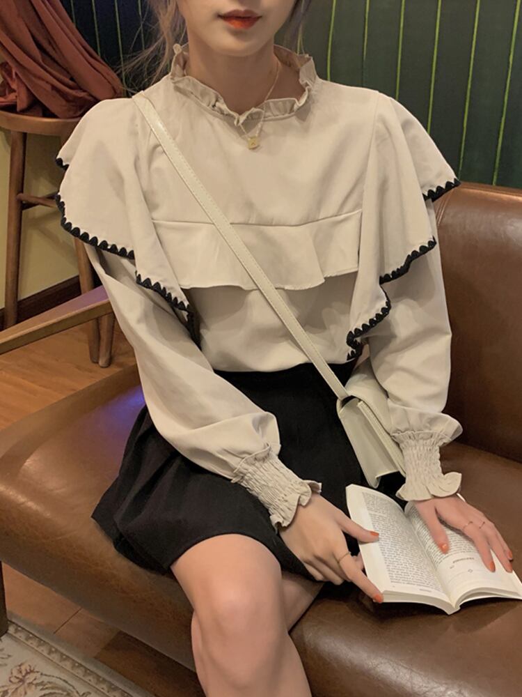 ブラウス シャツ 長袖 フリル シンプル 無地 大人可愛い パイピング デート お出かけ 秋 春