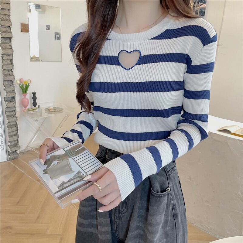 カットソー 長袖 シンプル 大人カジュアル ラウンドネック ハート型 ボーダー柄 薄手 インナー 春