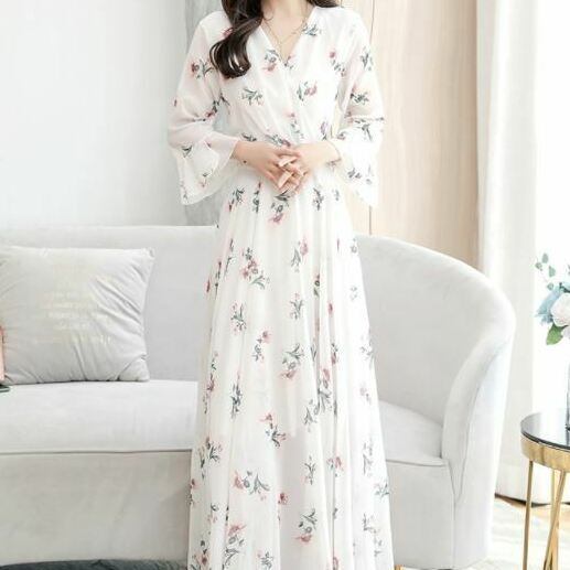 ワンピース シフォンワンピース 長袖 ロング丈 マキシ丈 フレア 花柄 小花柄 大人可愛い きれいめ 上品