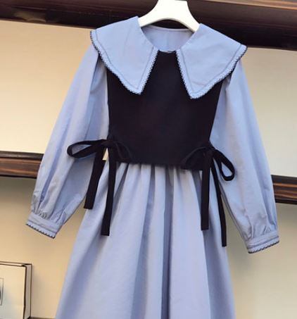 ワンピース 長袖 膝丈 フレア ベスト付き ビックカラー シンプル 無地 大人カジュアル デート お出かけ