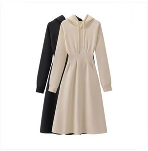 ワンピース スウェットワンピース 長袖 膝丈 フレア フード ウエストギャザー シンプル 無地 大人カジュアル
