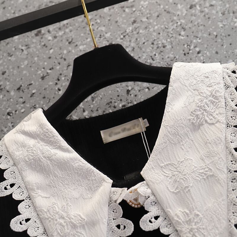 ワンピース 長袖 ミニ丈 ビックカラー レース襟 モノトーン きれいめ 大人可愛い デート お出かけ