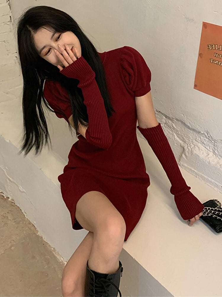 ワンピース ニットワンピース 半袖 ミニ丈 パフスリーブ アームウォーマー 大人可愛い デート お出かけ
