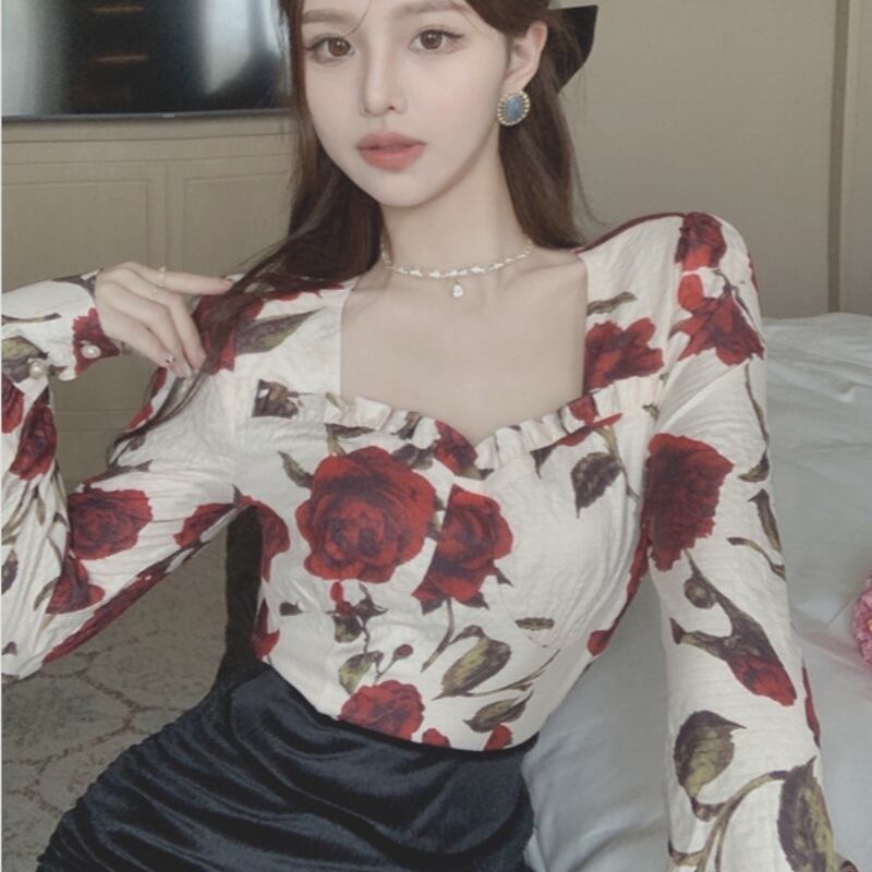 ブラウス カットソー 長袖 スクエアネック 花柄 上品 きれいめ エレガント デート お出かけ