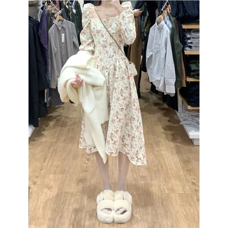 ワンピース 膝丈 フレア 長袖 小花柄 オフショルダー パフスリーブ 大人可愛い デート お出かけ