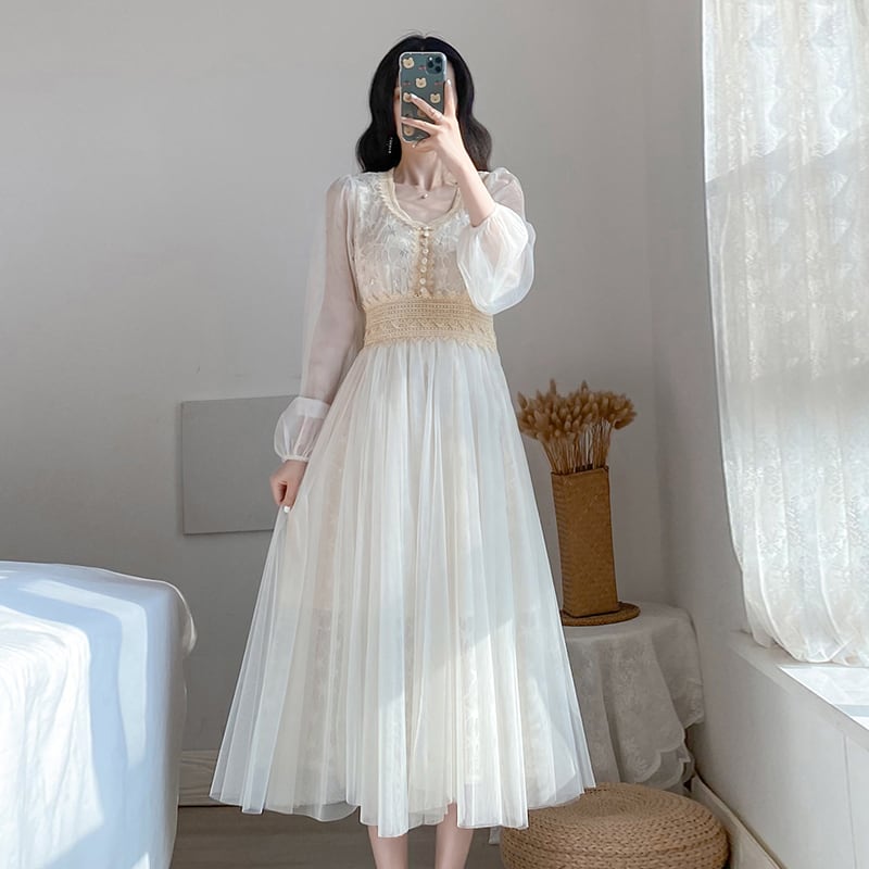 ワンピース チュールワンピース 長袖 フレア レース ミモレ丈 きれいめ 上品 大人可愛い フォーマル
