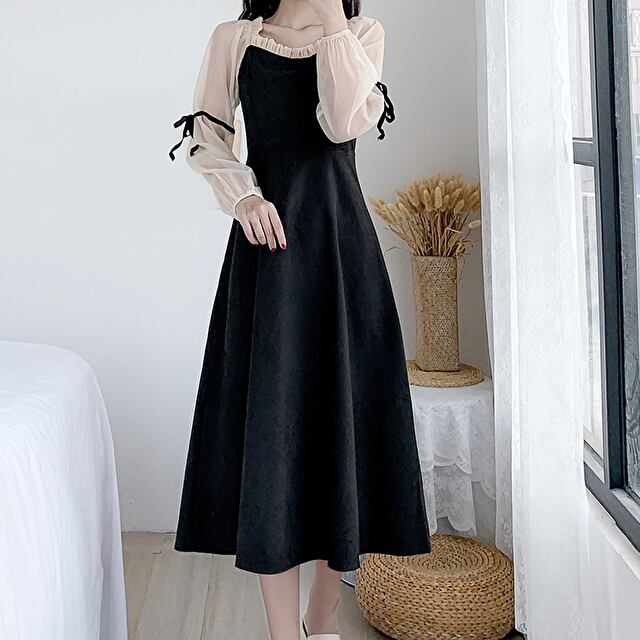 ワンピース 長袖 ミモレ丈 フレア 切り替えデザイン リボン 大人可愛い デート お出かけ