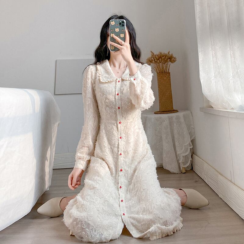 ワンピース シャツワンピース 長袖 ミモレ丈 ロング丈 フレア 花柄デザイン 大人可愛い デート