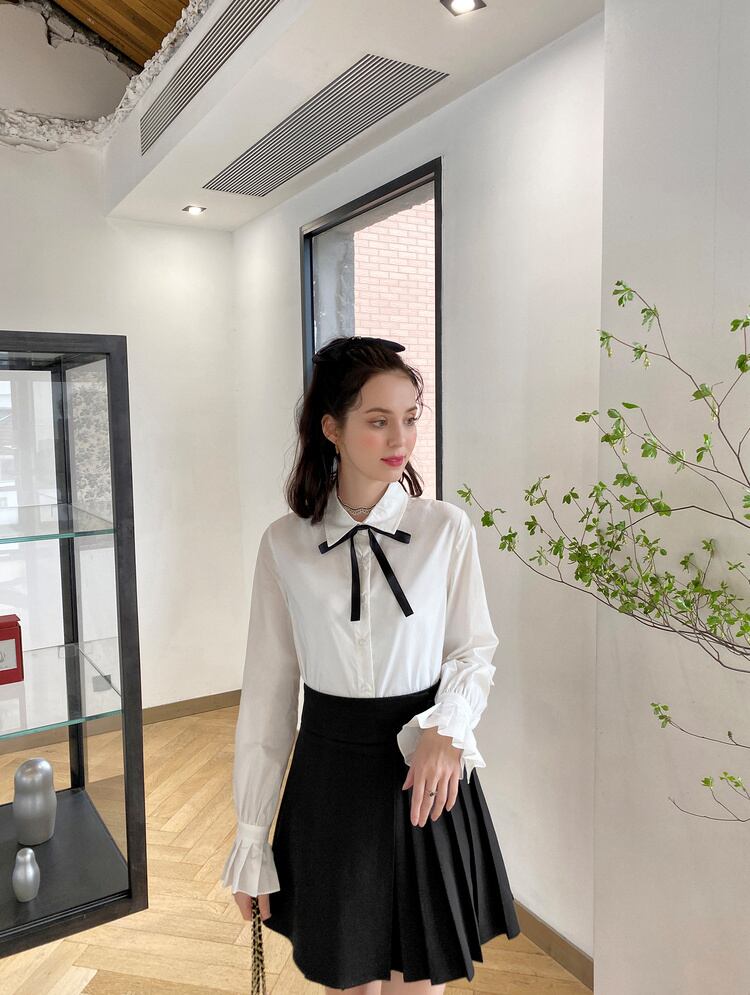 セットアップ ツーピース ブラウス 長袖 リボン ワンピース ノースリーブ ミニ丈 フレア 大人可愛い