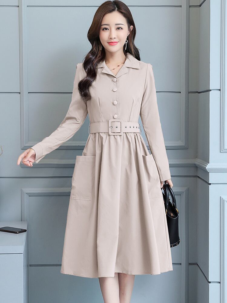 ワンピース シャツワンピース 長袖 膝丈 フレア ウエストベルト シンプル 無地 大人カジュアル